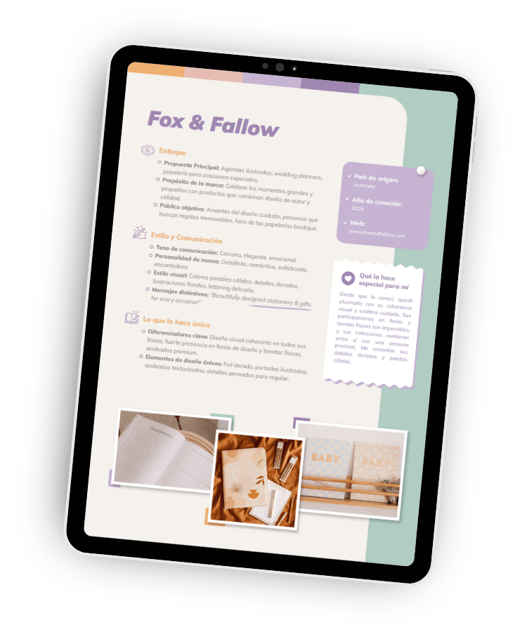 Una guía curada para ayudarte a encontrar tu estilo visual y crear productos con alma. Incluye fichas con 20 marcas reales, 60 imágenes seleccionadas, comentarios personales y ejercicios para despertar tu mirada creativa.